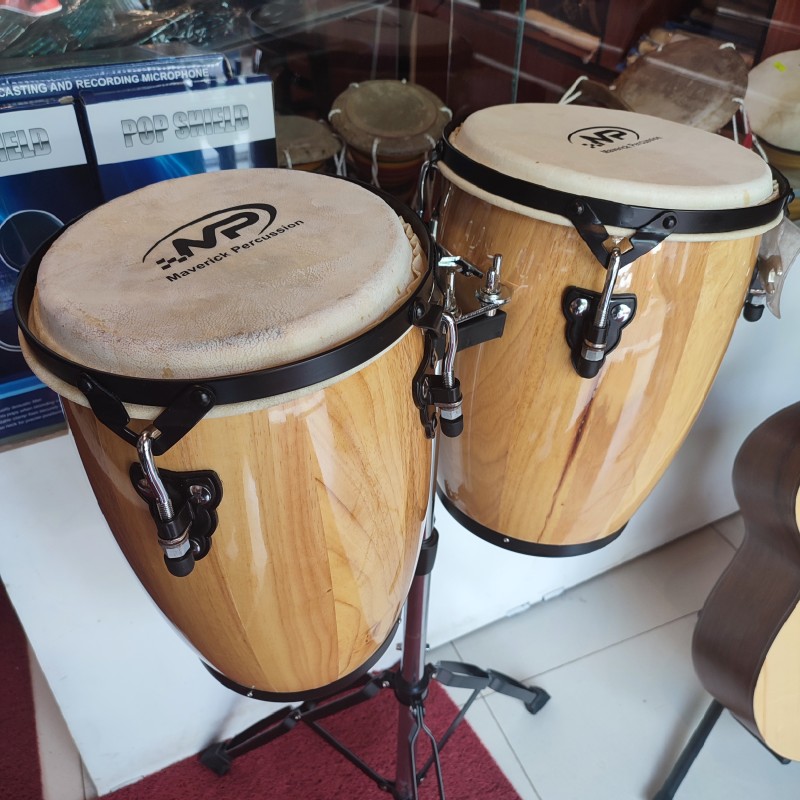 The Maverick Percussion Wood Conga Set makes a perfect instrument for everyone from beginners to students to performing musicians. Each of the two 14"-high congas in the MP Wood Conga Set is equipped with reliable, rugged hardware, comfortable EZ Curve rims, robust tuning lugs, a tuning wrench, and natural rawhide heads. You also get a height-adjustable double conga stand that holds the 9" and 10" drums in place. These congas sound great and are made to last. You'll love playing on the MP Wood Conga Set!
