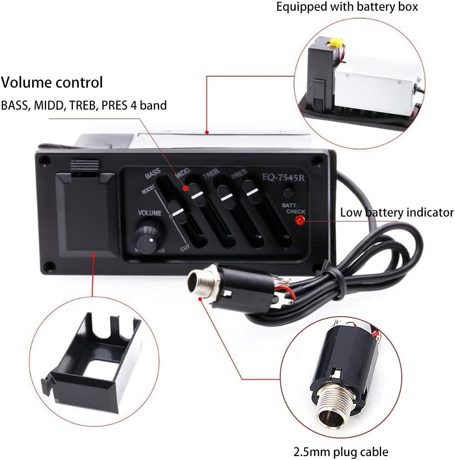 Features: 1. This guitar pickup equalizer is pre-wired for easy assembly without further requirements. 2. Professional EQ microphone compatible BASS, MIDD, TREB, PRES 4-band and volume control 3. Equipped with a battery case, can hold batteries, which guarantees a long operating time. 4. Comes with 2.5mm plug cable and low battery indicator, suitable for classic, acoustic and folk guitars. 5. Made of high quality material and durable for long service life. Features: Item type: guitar pickup equalizer Material: plastic and metal. Colour: black PRES control: ± 12 dB at 8 kHz. Bass control: ±12dB at 600Hz. MIDD control: ±12dB at 600Hz. TREB control: ± 12 dB at 2.2 kHz. Input impedance: 10 MΩ Frequency response: 20 Hz - 20 kHz Power supply: 9V alkaline battery (not included) Suitable for acoustic guitar. Cable size: approx. 2.5 mm. Package Content: 1 x Guitar Mic Equalizer 1 x Cable 1 x Suction Cup 1 x Slim Belt 1 x Nut 1 x gasket
